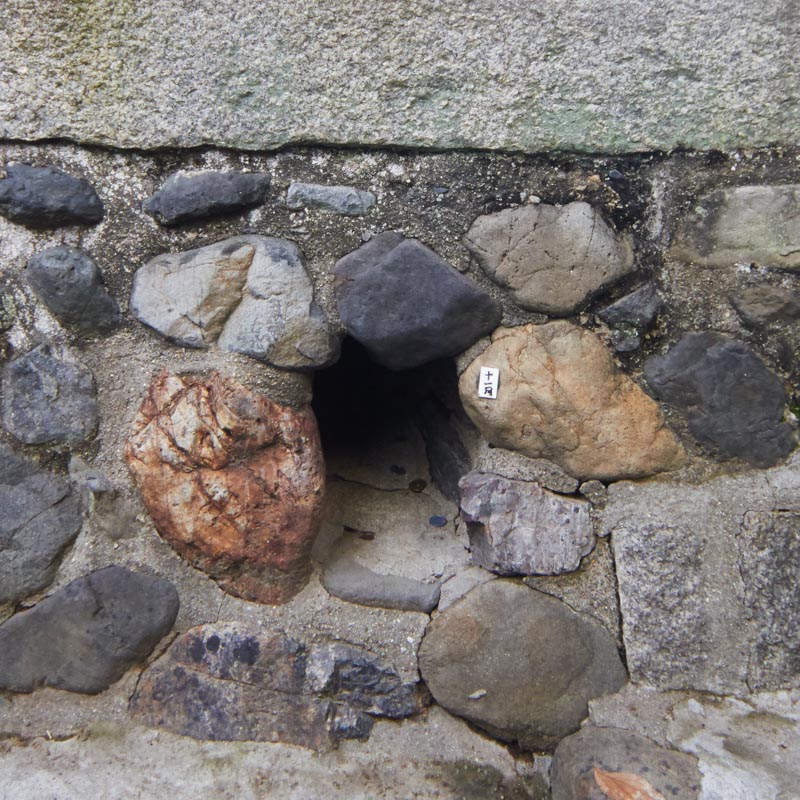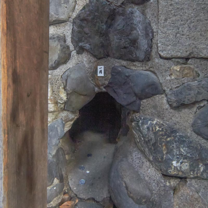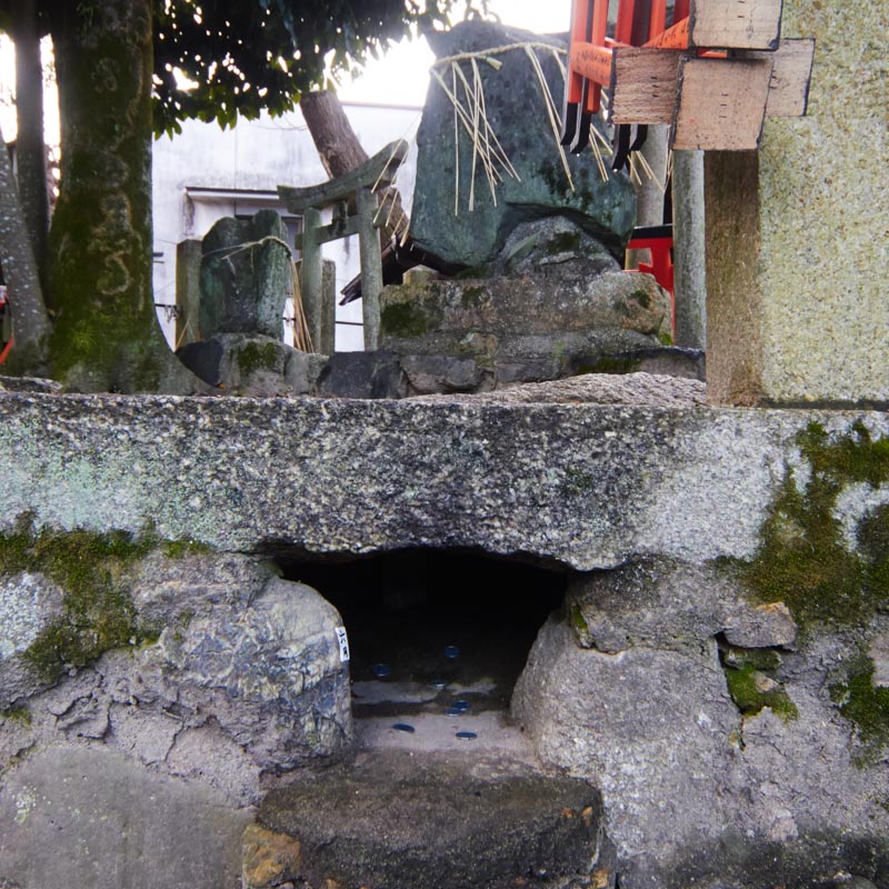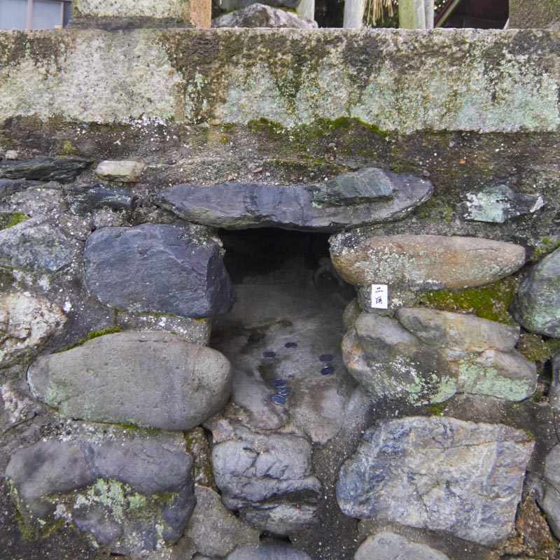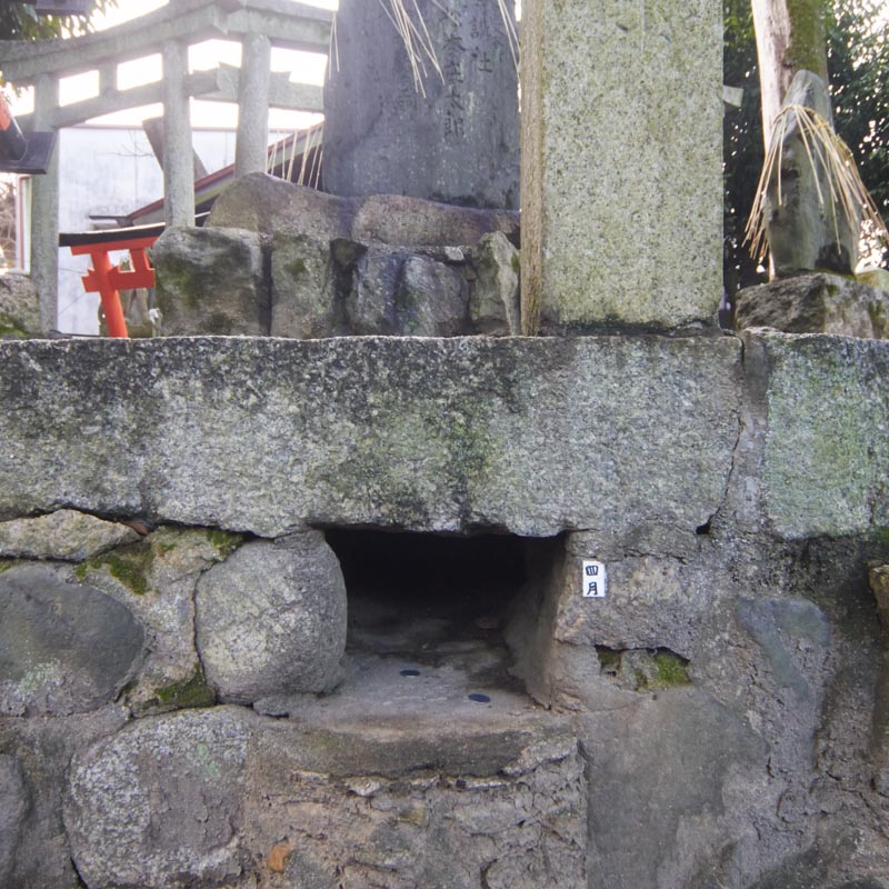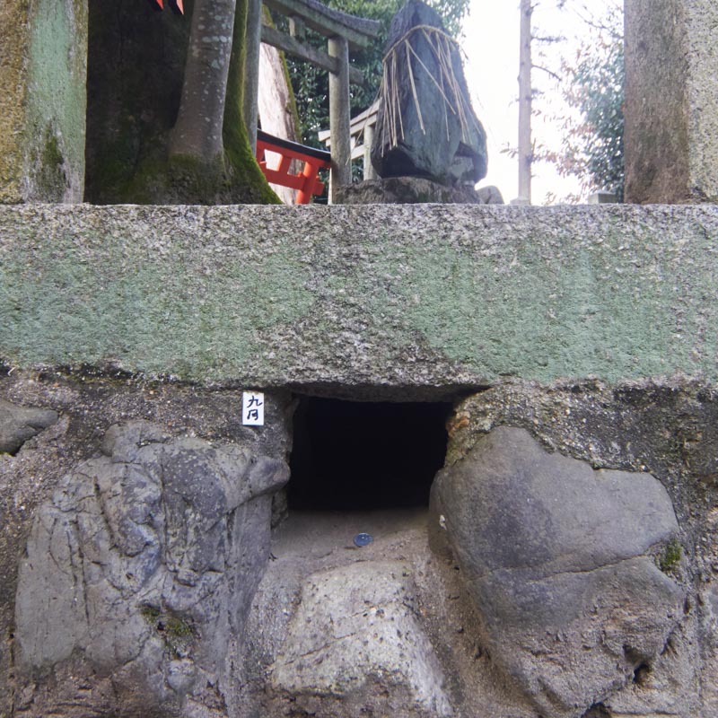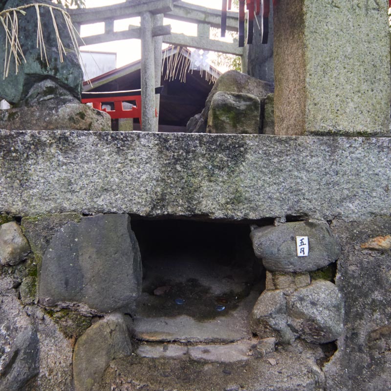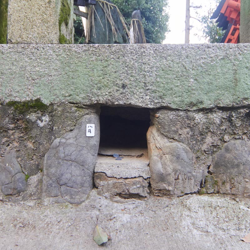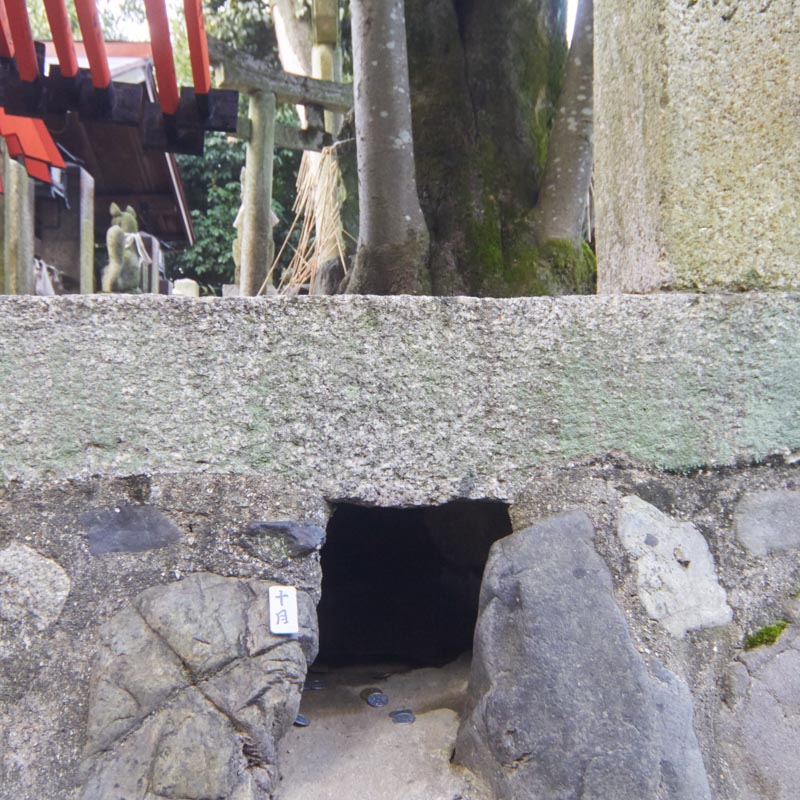 現在、このこんもりとした台地の周囲には12ヶ所の狐穴があり、拝殿に向かって左から時計廻りに1月穴〜12月穴となっています。ろうそくを献燈し拝殿にお供えと共に祈りをささげ、予定産み月の狐穴に祈願すると、無事、安らかに産まれると言われております。